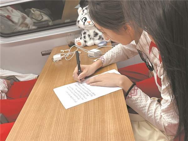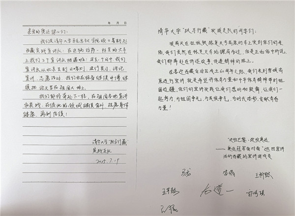 此前,四位同學(xué)已看過(guò)奧運(yùn)冠軍在林芝的宣講新聞,能在列車上與冠軍“隔空相遇”,讓他們既驚喜又遺憾。因?qū)嵺`支隊(duì)需趕往下一站開(kāi)展宣講和志愿活動(dòng),他們沒(méi)有時(shí)間與冠軍們當(dāng)面交流。“兩支宣講隊(duì)伍,一個(gè)在學(xué)術(shù)領(lǐng)域刻苦鉆研,一個(gè)在體育賽場(chǎng)上不懈拼搏,我們都在為建設(shè)祖國(guó)而奮斗?!睂?shí)踐支隊(duì)隊(duì)長(zhǎng)左宏量說(shuō)。當(dāng)隊(duì)員王珺儀提議寫(xiě)一封信轉(zhuǎn)交奧運(yùn)冠軍時(shí),大家都為這個(gè)想法感到興奮,迅速著手起草。信中,四位清華學(xué)子寫(xiě)下了他們的心聲: