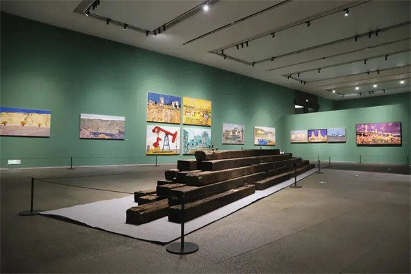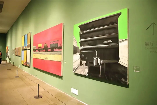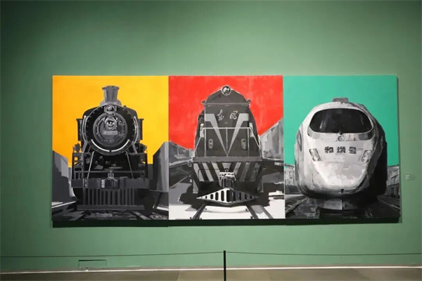 序廳以《奔騰·歲月》開(kāi)篇,描繪中國(guó)鐵路發(fā)展的重要階段。作品中的機(jī)車主體以黑、白、灰為主色調(diào),盡顯硬朗雄厚的力量感;而背景的紅、黃、綠三種高飽和度純色,則為機(jī)械的冰冷感賦予了強(qiáng)烈的當(dāng)代視覺(jué)沖擊力。觀眾得以從中國(guó)鐵路的巨變中,真切感受到中國(guó)的飛速發(fā)展和時(shí)代變遷。